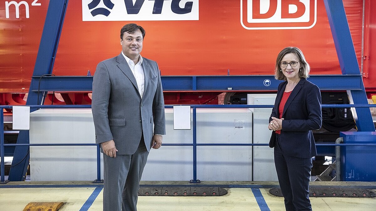 Dr. Sigrid Nikutta, DB-Vorstand Güterverkehr und Vorstandsvorsitzende DB Cargo, und Heiko Fischer, Vorsitzender des Vorstandes der VTG AG, präsentieren m²-Wagen; Quelle: Deutsche Bahn AG / Pablo Castagnola