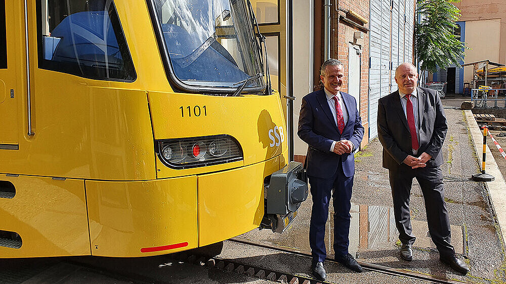 Oberbürgermeister Frank Nopper und Thomas Moser, Technikvorstand der Stuttgarter Straßenbahnen AG (SSB), stellten die erste Zuggarnitur der Presse vor; Quelle: SBB